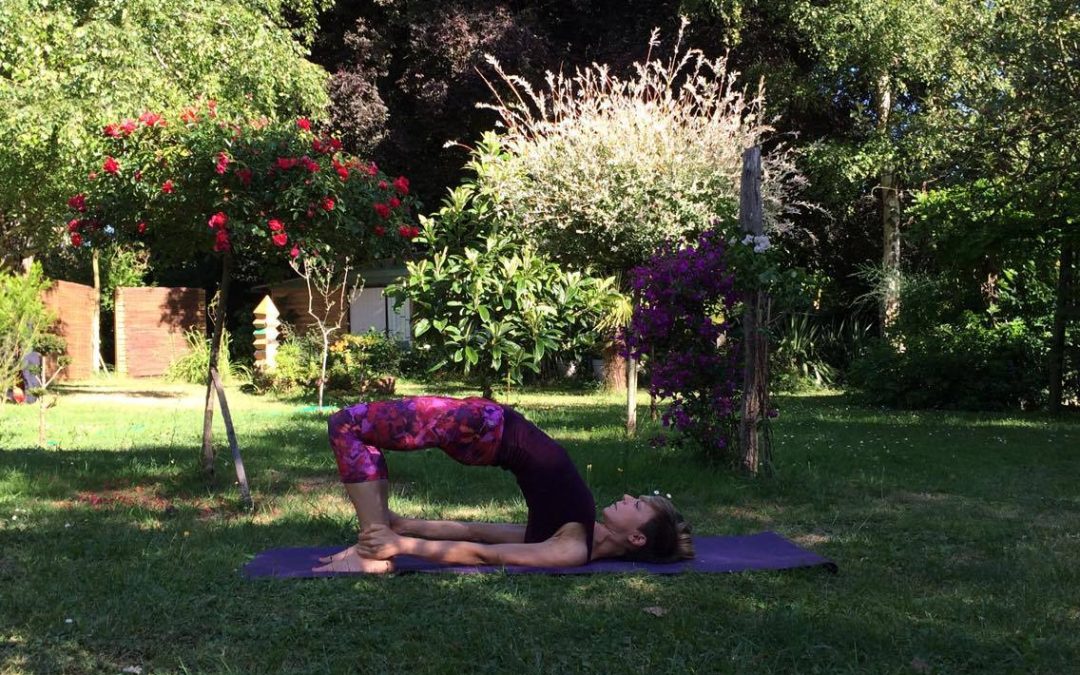 Repeat the steps described in version one, then ‘walk’ your shoulders forward so you can catch hold of your ankles. This will deepen the backbend, so if you’ve already gone far enough, just repeat the previous posture.