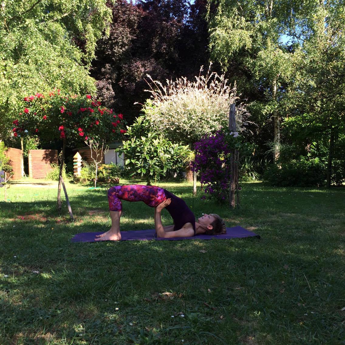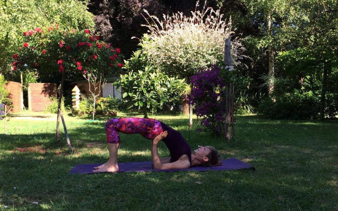 Come into a supported bridge pose, taking care to keep your thighs parallel, toes pointing forward. Draw your chest towards your chin and hold for up to five breaths. As you release, feel your vertebrae settle onto the mat one by one.