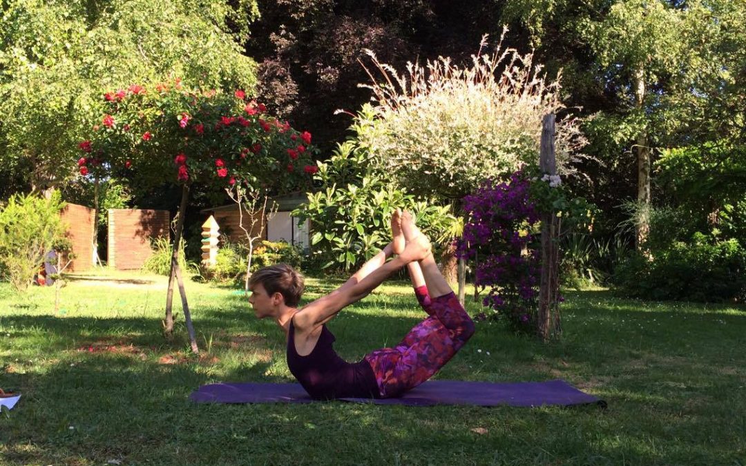 Take hold of both feet and, as you inhale, lift your chest and thighs away from the mat. Try not to let your knees move apart – keep your thighs parallel. Hold for up to five breaths, release and repeat one or two more times.